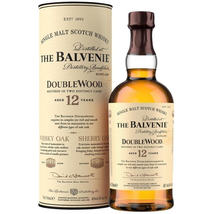 DoubleWood 12 was launched in 1993, using a process designed by our Malt Master David Stewart in 1982, now commonly known as ‘wood finishing’. To make The Balvenie DoubleWood, David Stewart MBE takes whisky that has spent at least 12 years in traditional whisky casks, American Oak ex-bourbon barrels and hogsheads, and moves it to Spanish oak ex-Oloroso sherry casks for an additional nine months. The whisky is then transferred to large oak vessels called “tuns” for 3-4 months to allow the whiskies from individual casks to “marry”. The Balvenie DoubleWood single malt whisky gains its distinctive character from being matured in two different wood types. Each stage lends different qualities to the resulting single malt whisky. The traditional casks soften and add delicate character, the sherry wood brings depth and fullness of flavor and the final few months in our tuns allow the whiskies to marry harmoniously. – NOSE: Sweet fruit and Oloroso sherry notes, layered with honey and vanilla. – TASTE: Smooth and mellow with beautifully combined flavors – nutty sweetness, cinnamon spiciness and a delicately proportioned layer of sherry. – FINISH: Long and Warming.