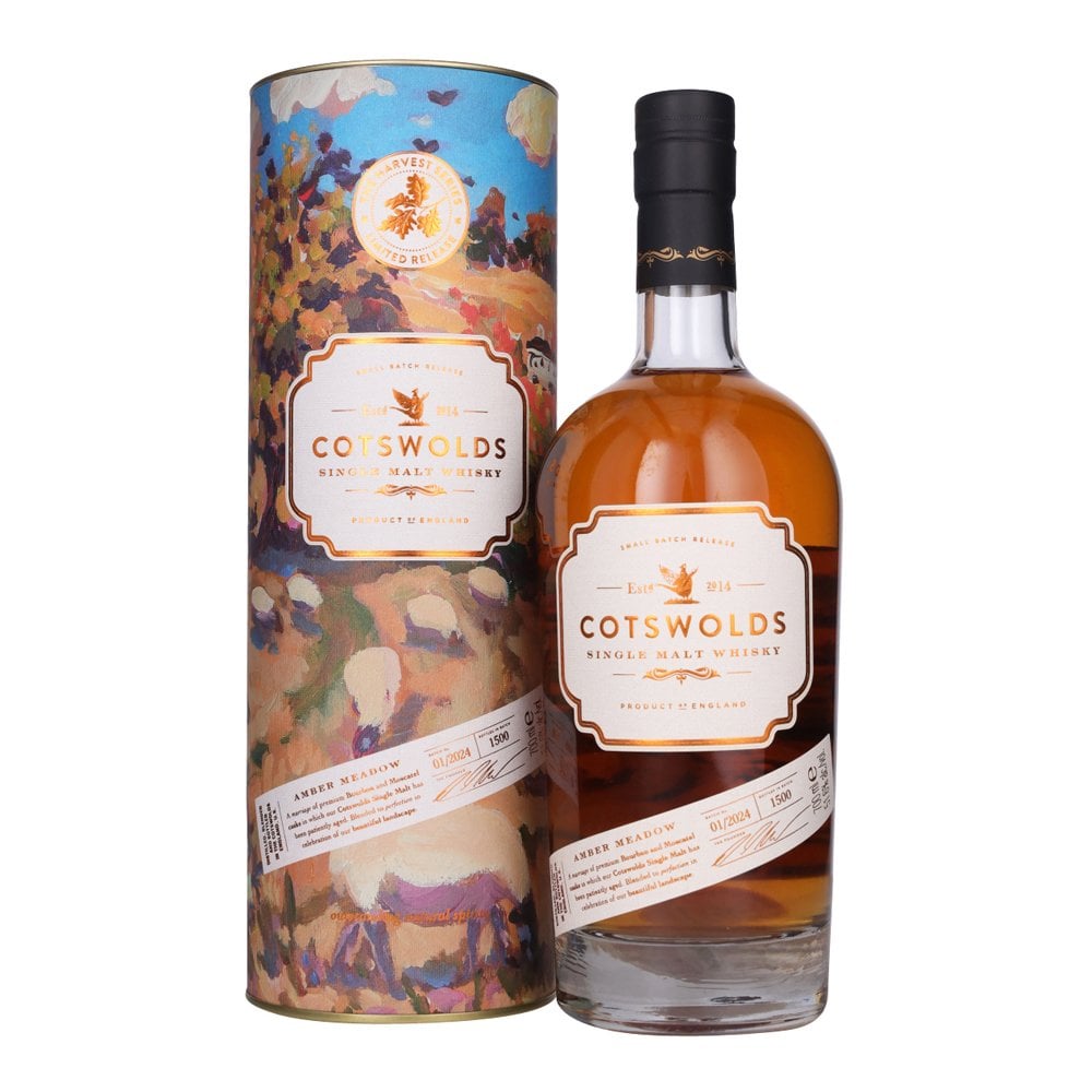 Amber Meadow is an evocative name for this limited edition single malt by English distillery, Cotswolds. Matured in premium ex-bourbon casks and ex-Moscatel wine barrels. This is award winning distillery Cotswolds third release as part of their exclusive Harvest Series. The bottle is beautifully decorated with local artist Lucy Pratt’s artwork. Notes of meadow flowers and toasted malt.
