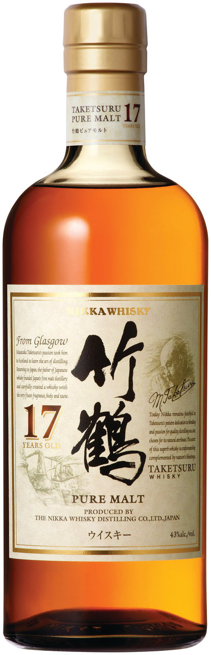 Nikka Taketsuru Pure Malt 17 Year Old Japanese Whisky has a perfect balance of gentle malt flavors and spiciness. This 17 year old whisky is aged in a combination of casks from Yoichi and Miyagikyo. Sherry butts provide the key component, with bourbon barrels as a complement. 43% ABV 750ml